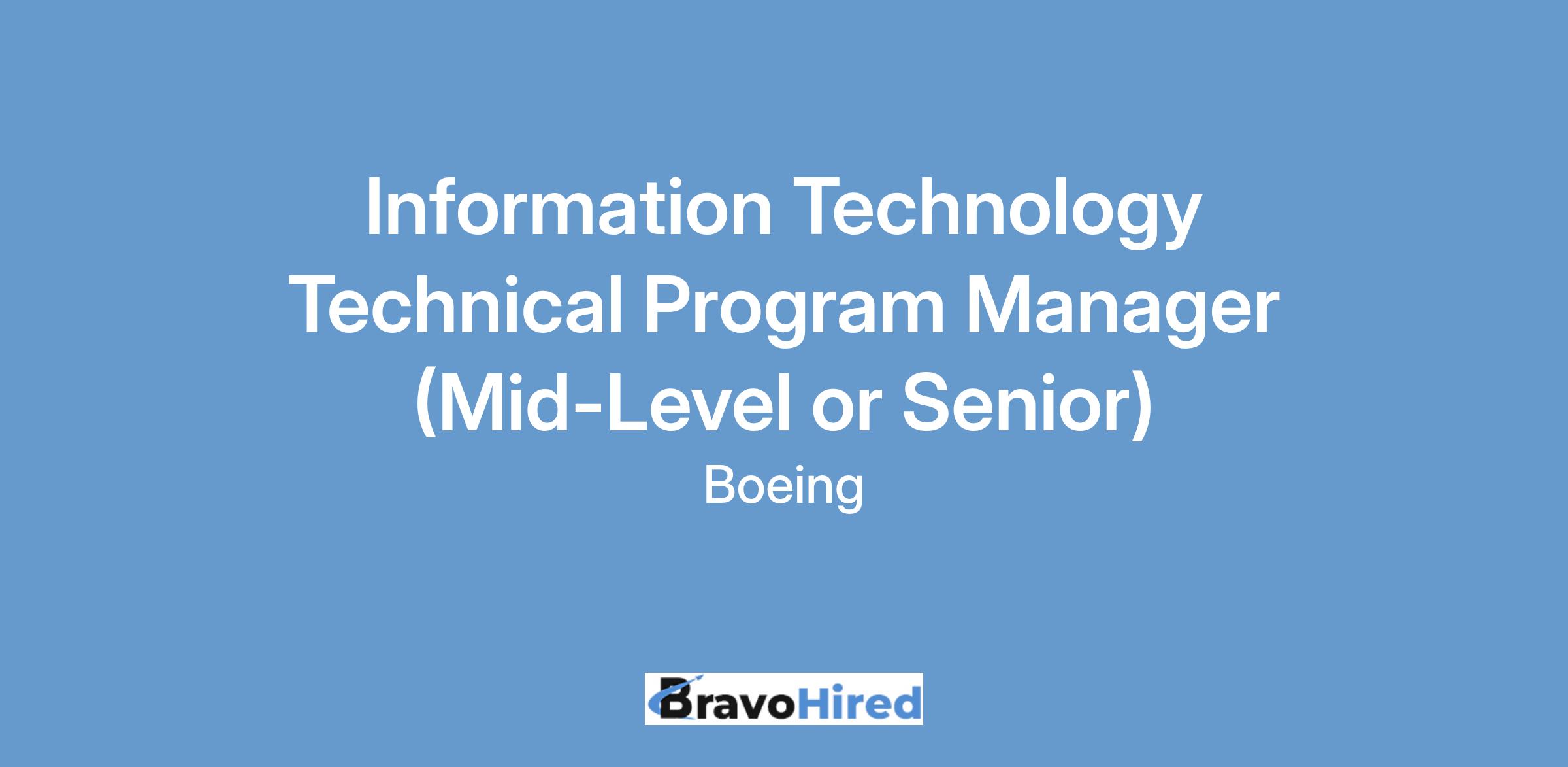 The Boeing CompanyThe Boeing Company is looking for a highly experienced and detail-oriented Information Technology Technical Program Manager (Mid-Level or Senior) to join the team in Everett, WA or North Charleston, SC.