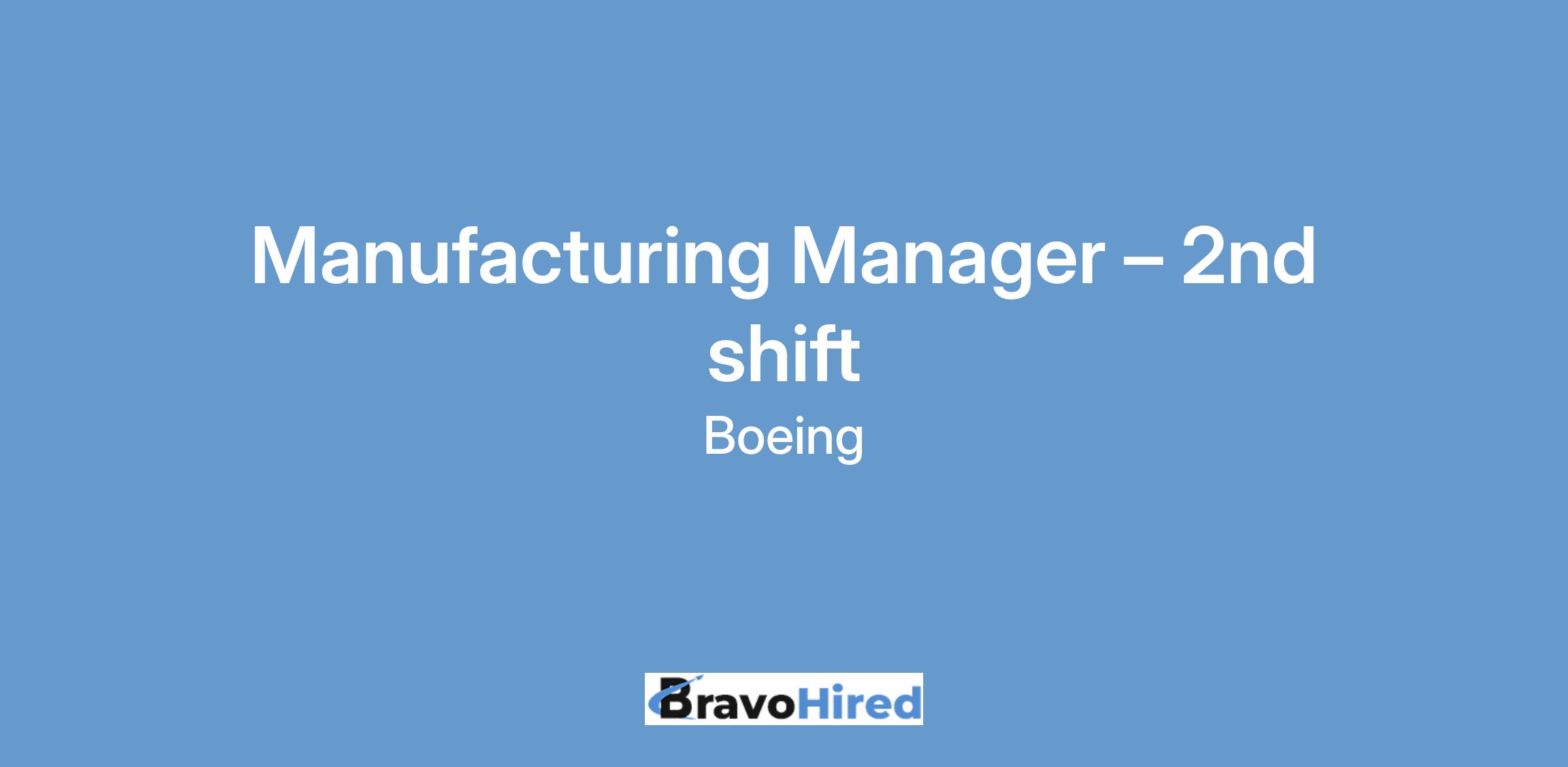 The Boeing CompanyBoeing Defense, Space and Security (BDS) Space Intelligence & Weapons Systems (SI&WS) has an exciting opportunity for an innovative, highly motivated, people-focused, and growth-motivated 2nd Shift Manufacturing Operations Manager to join our dynamic Experimental Systems Group (ESG) team at Kennedy Space Center, FL