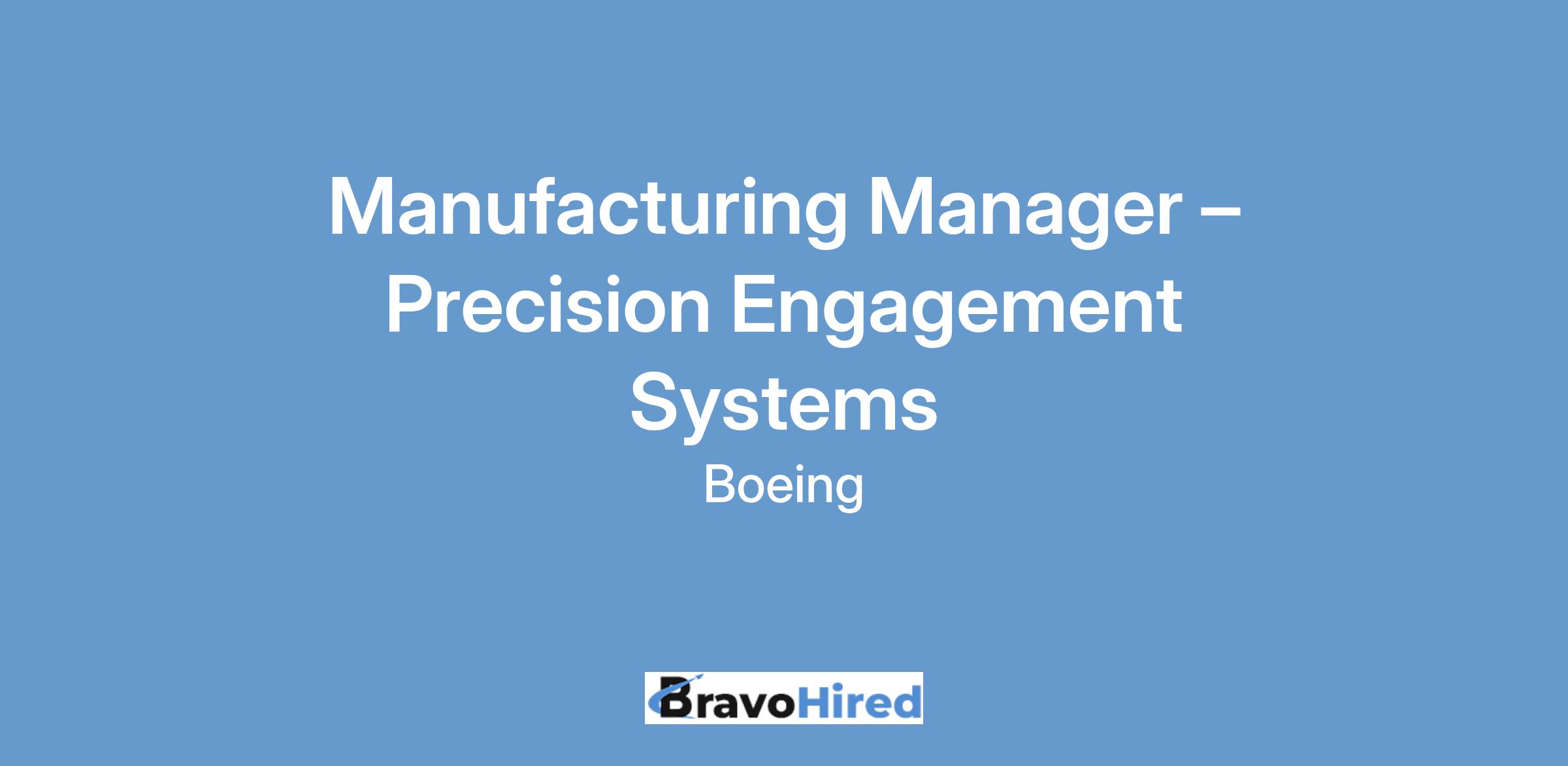 The Boeing CompanyBoeing Defense, Space and Security (BDS) has an exciting opportunity for a Manufacturing Manager to join our Precision Engagement Systems team in St. Charles, Missouri!