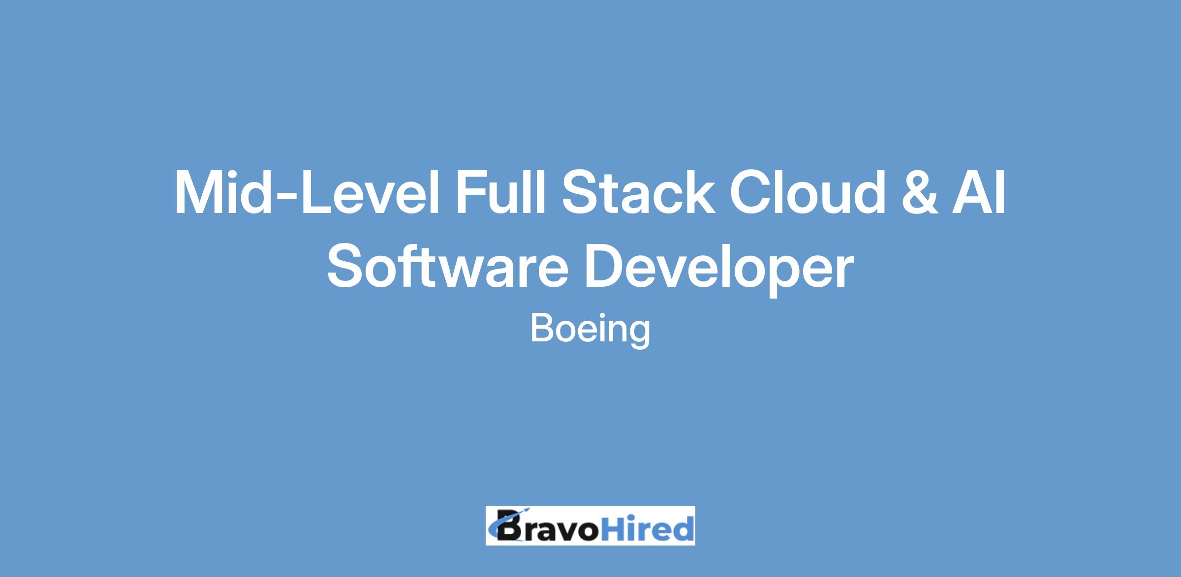 The Boeing CompanyThe Boeing Company’s Information Digital Technology & Security (IDT&S) is currently seeking a Mid-Level Full Stack Cloud & AI Software Developer to join the Enterprise Artificial Intelligence (AI) and Data (EAI&D) team in North Charleston, SC; Arlington, VA; Auburn, WA; Berkeley, MO; Chicago, IL; El Segundo, CA; Everett, WA; Huntington Beach, CA; Huntsville, AL; Long Beach, CA; Mesa, AZ; Oklahoma City, OK; Plano, TX; Renton, WA; Ridley Park, PA; San Antonio, TX; Seal Beach, CA; or Seattle, WA.