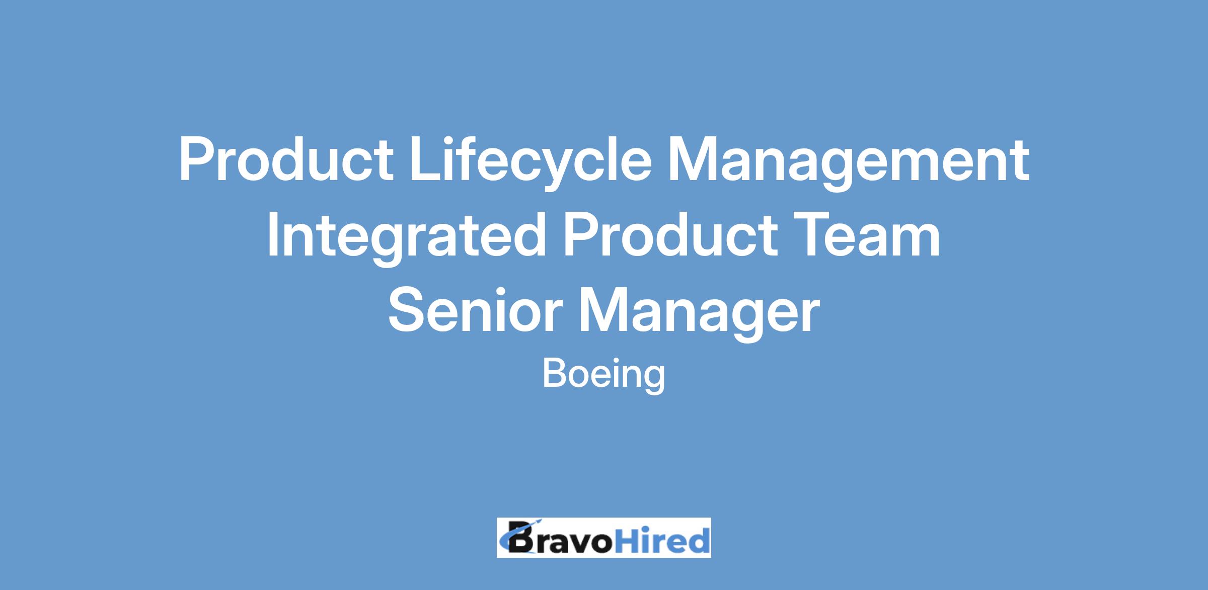 The Boeing CompanyBoeing Defense, Space, and Security (BDS) Sapphire is looking for a dynamic Product Lifecycle Management Integrated Product Team Senior Manager to join the team in Berkeley, MO; Arlington, VA; El Segundo, CA; Houston, TX; Huntington Beach, CA; Huntsville, AL; Mesa, AZ; Oklahoma City, OK; San Antonio, TX; Ridley Park, PA; Plano, TX; Seal Beach, CA; or Seattle, WA.