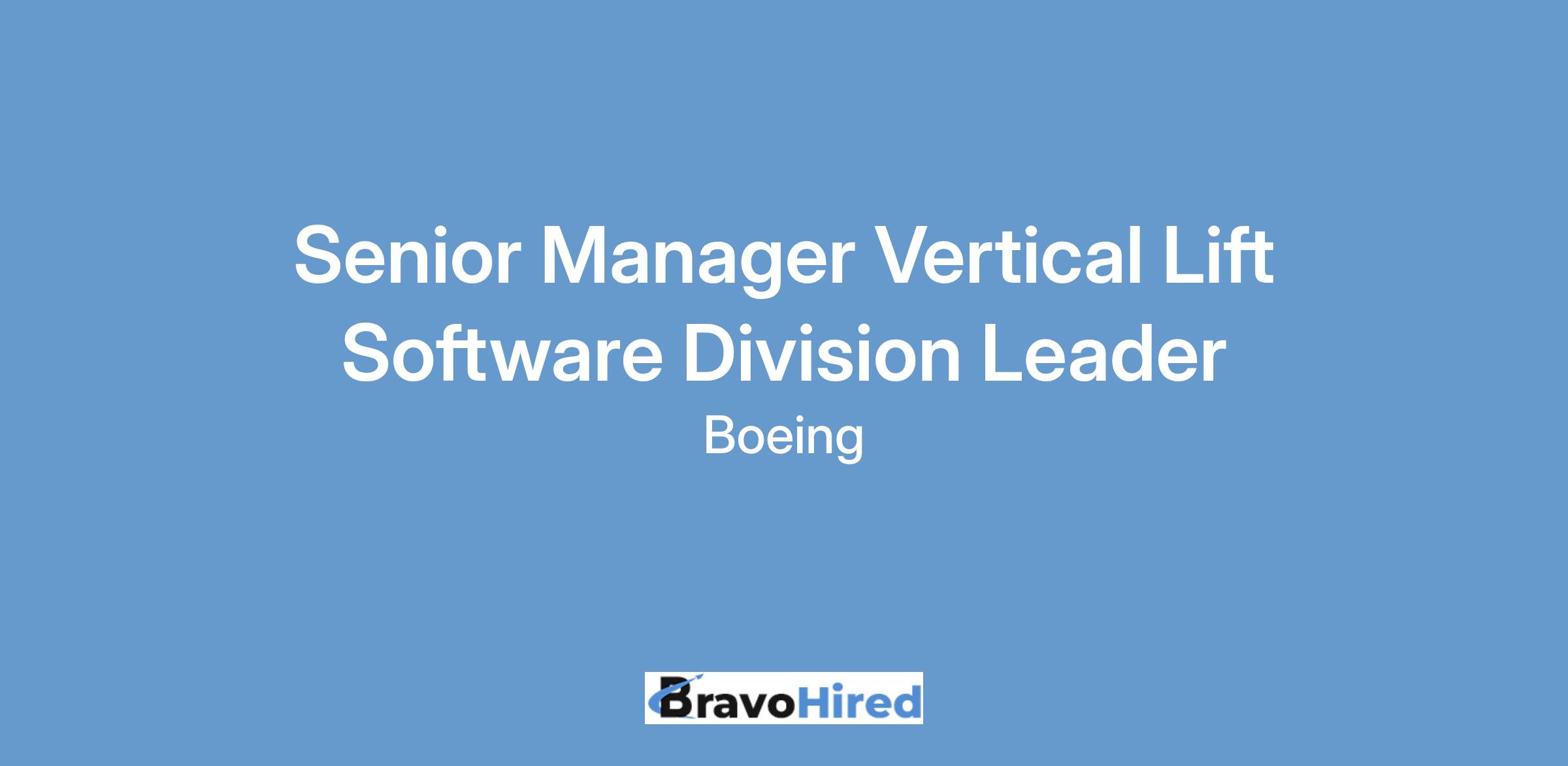 The Boeing CompanyThe Boeing Company is looking for a Senior Manager Vertical Lift Software Division Leader to join our team in Ridley Park, PA or Mesa, AZ. This engineering position will provide leadership for the software efforts across the Vertical Lift division of Boeing Defense, Space & Security business unit. Working with our customers, the team develops and tests next-generation technologies software for vertical lift platforms.