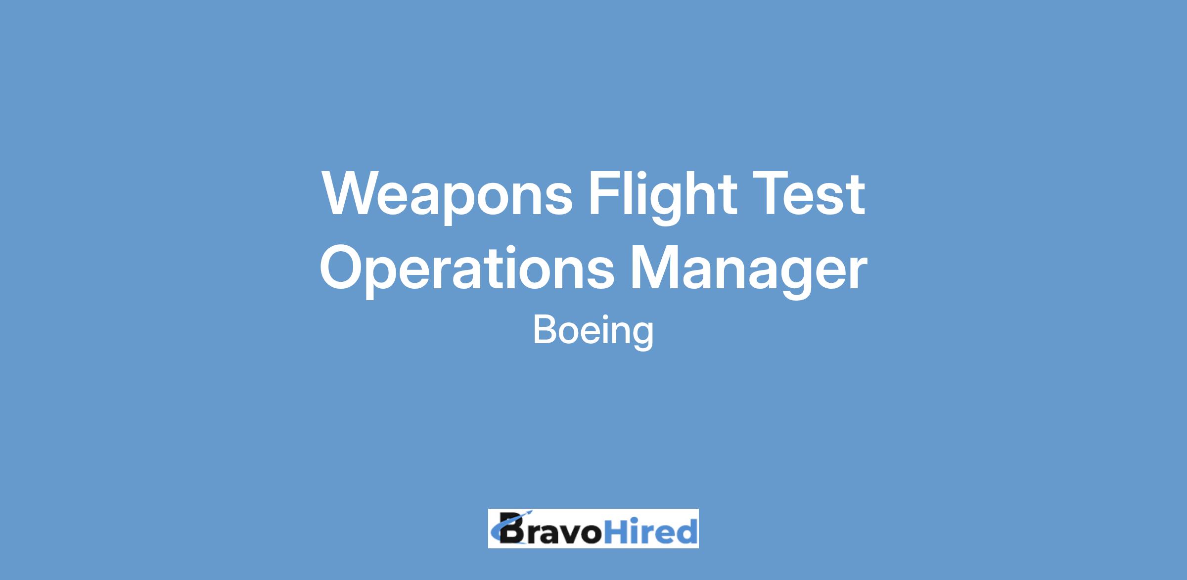 The Boeing CompanyThe Boeing Test & Evaluation (BT&E) Flight Test organization has an opening for a Weapons Flight Test Operations (FTO) Manager in Saint Charles, MO. This position is focused on supporting a variety of weapon systems programs (JDAM, SDB, B61, Harpoon, etc.) and proprietary programs primarily based out of Saint Charles, MO.